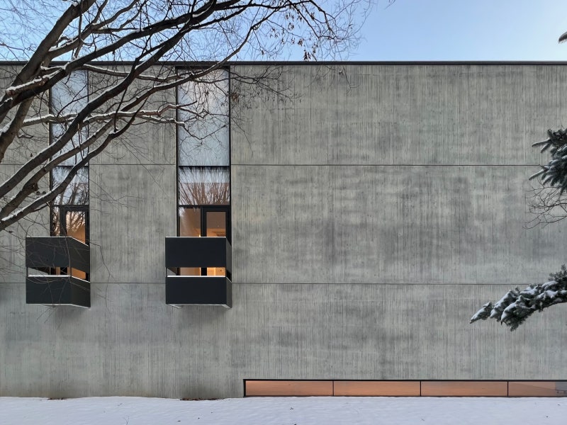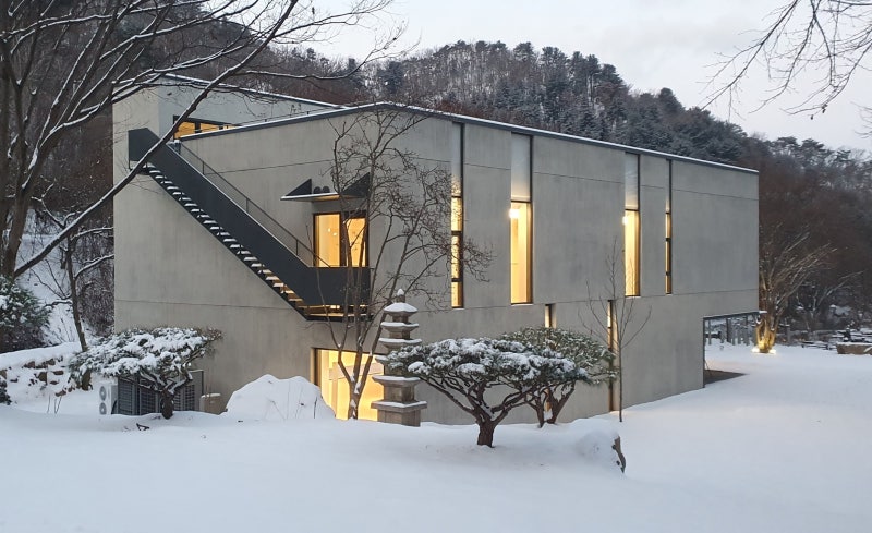 이 공연장은 산세와 물소리 그리고 서향 빛을 담아 음지였던 대지를 양지로 바꿔주는 건축이어야 했다. 외장은 옹이가 많은 삼나무를 거푸집으로 사용한 노출 콘크리트를 사용하였다. 외장재는 목조식당의 나무와 노란 샌드스톤 마감의 기존 건물과 대비적이면서도 어울리는 재료로 고른 것이 삼나무 무늬 노출이다. 삼나무는 고동색의 옹이 색상이 콘크리트에 배는 특징이 있어 노란빛을 품은 콘크리트와 결합되면 제법 어울리는 분위기가 만들어질 것을 기대했다. 삼나무의 옹이를 거푸집으로 사용하면 형상뿐아니라 색상도 콘크리트에 배어나와 실제 목재와 콘크리트의 중간쯤 보이게 된다. 여러 재료를 검토한 끝에 결국 단지의 가장 뒷쪽에 가장 단단한 콘크리트 벽으로 단지를 마무리하는 것이다.