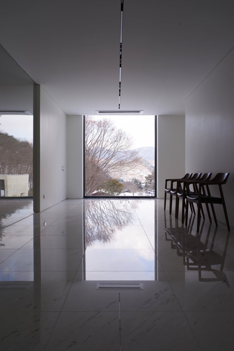 내부공간은 무채색에 가까운 백색의 공간을 만들었다. 백색 수성페인트와 밝은 오크 바닥재 그리고 폴라리스 대리석을 조합하였다. 피아노가 다니는 곳은 오크로, 사람의 공간과 이동은 대리석으로 그밖의 공간은 백색의 수성페인트로 마감하여 인공조명을 최소화 하였다. 대리석 마감은 사람이 닫는 곳으로 오염을 쉽게 청소하기 위한 방편이자 외부경관을 더욱 극적으로 끌어들이는 장치이다. 백색에 가까운 내부공간은 피아노가 주인이 되고, 데셍을 위한 석고상이 빛을 보기위해 백색인 것처럼 공연이 진행함에 따라 조금씩 변하는 공간의 빛의 변화가 잘 드러나도록 했다. 이를 위하여 천장을 가능한 깨끗하게 정리하고 흡음재도 굴곡이 없는 것을 사용하여 흡음과 반사 등 음향을 위한 장치조차 노출하지 않았다. 이곳의 '음악의 시간'은 변화하는 '자연광의 공간'과 함께 감상한다. 시각과 청각이 복합된 감각을 여는 여유가 있어야 이곳의 공연을 제대로 즐긴다.